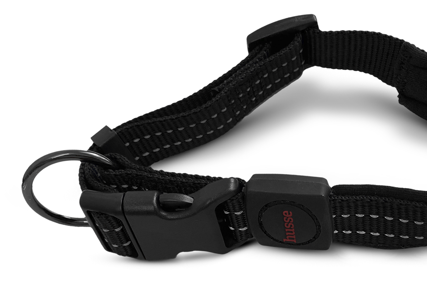 Reflekterande och justerbart halsband av slitstark nylon med en neopren-vadderad baksida för optimal komfort. Den unika placeringen av den svetsade O-ringen möjliggör enkel fastsättning av ett koppel. Designen säkerställer att, om hunden sliter sig, spännet fångas upp du kan åter fästa halsbandet i kopplet.