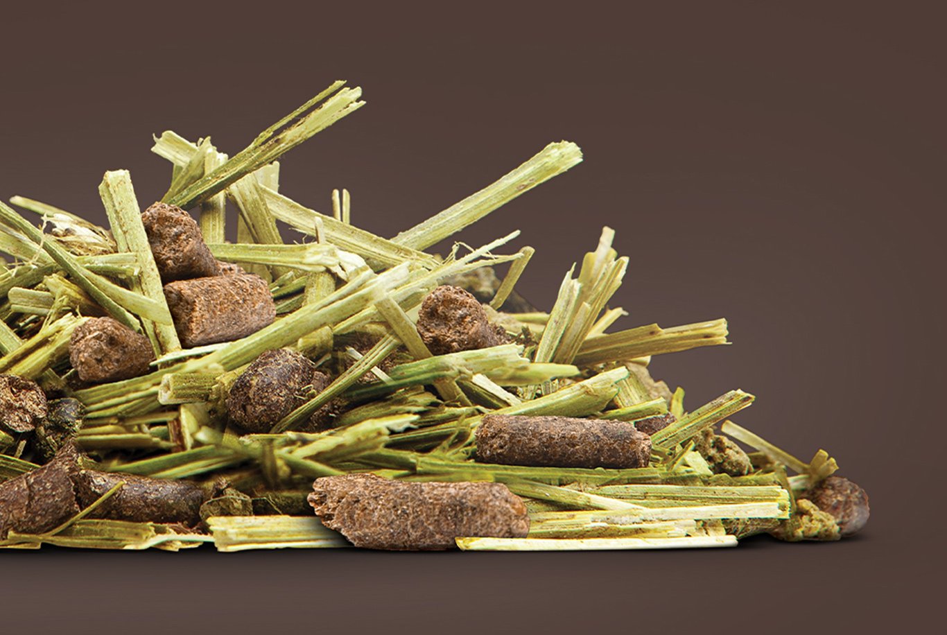 linfröpellets, alfalfastjälkar, alfalfapellets, expanderat linfrö, expanderade grönsaker, linolja, jäst, galakto-oligosackarider, mannan-oligosackarider, frukto-oligosackarider, biotin.