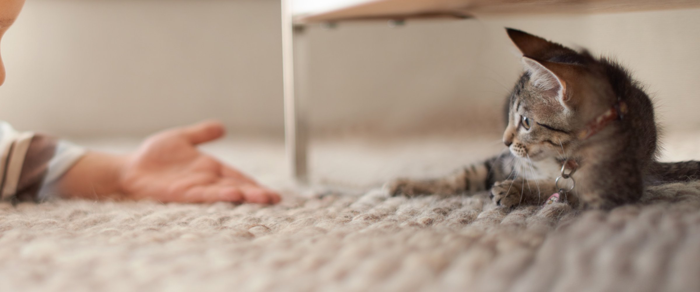 När din kattunge flyttar hem till dig har den precis separerats från sin mamma och syskon och nu behöver den hitta tryggheten igen hemma hos sin nya familj. Ibland måste man lämna sin katt ensam hemma och det kan vara bra att börja träna när den är liten, men när du börjar bör du bara lämna den mycket korta stunder. Till att börja med räcker det med att bara lämna rummet en stund, för att sedan gradvis uttöka tiden du är borta. Lek med din kattunge en liten stund innan du går så har den blivit av med lite energi och det blir enklare för den att slappna av. En trött kattunge går med största sannolikhet och lägger sig och sover när du går. Lämna gärna några favoritleksaker framme, eller sätt på en TV eller radio på låg volym.